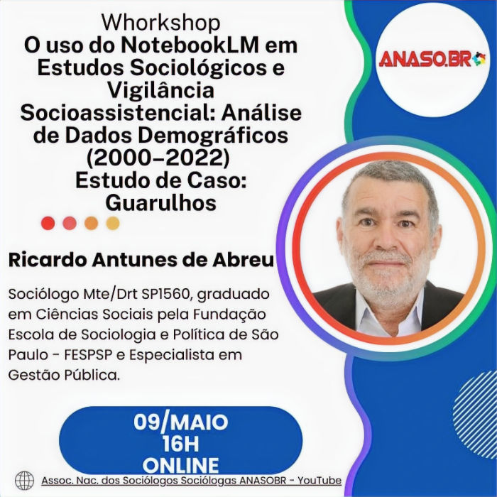 Introdução ao uso de ferramentas de inteligência artificial aplicadas à pesquisa sociológica, com foco no NotebookLM. Exploração de técnicas de organização, análise e interpretação de dados. Aplicação prática em vigilância socioassistencial por meio de estudo de caso do município de Guarulhos, abordando dinâmicas demográficas, transformações territoriais e indicadores demográficos no período de 2000 a 2022.